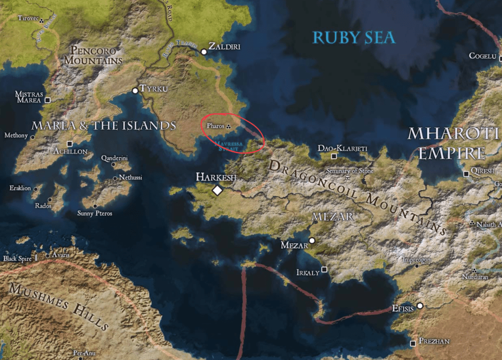 But there’s a better solution – replacing the ruins of Pharos with Parsantium and narrowing the Mavressa Strait so the city can sit astride two continents. Parsantium is lucky enough to have its own dragon – the bronze dragon Naelere, who has lived in the city for over 700 years and acts as its unofficial protector. Naelere’s presence explains why the Free City of Parsantium remains free instead of being absorbed into the Mharoti Empire.