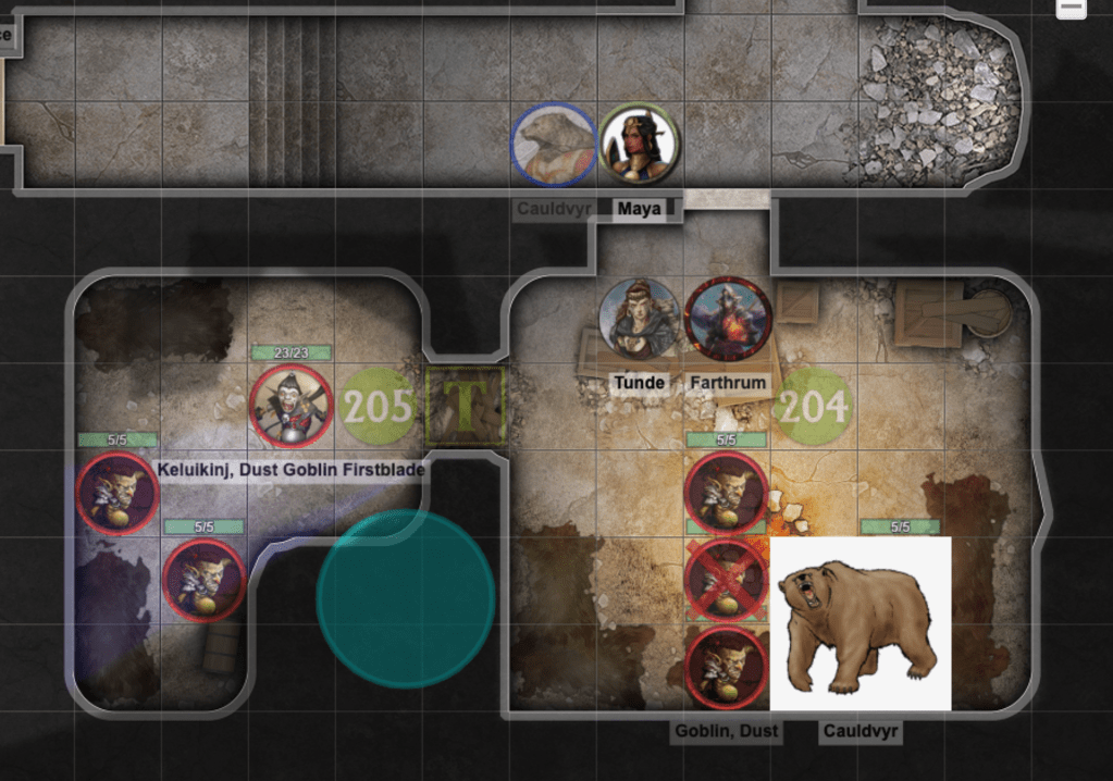 Continuing back around the corridor, the characters discover another secret door, leading to the dust goblins’ hideout. The crossbows are triggered by the goblins as soon as Tunde opens the door. Farthrum tries to topple the barrier but fails, but does manage to collapse the barrier to the adjoining chamber while trying to climb over it. Fortunately, he lands on his feet. Cauldvyr wild shapes into a bear and starts killing goblins and Tunde finishes off Firstblade Keluikinj, with sacred flame. They loot the goblins’ chambers, finding several potions and two mildewed books which intrigue Tunde.
