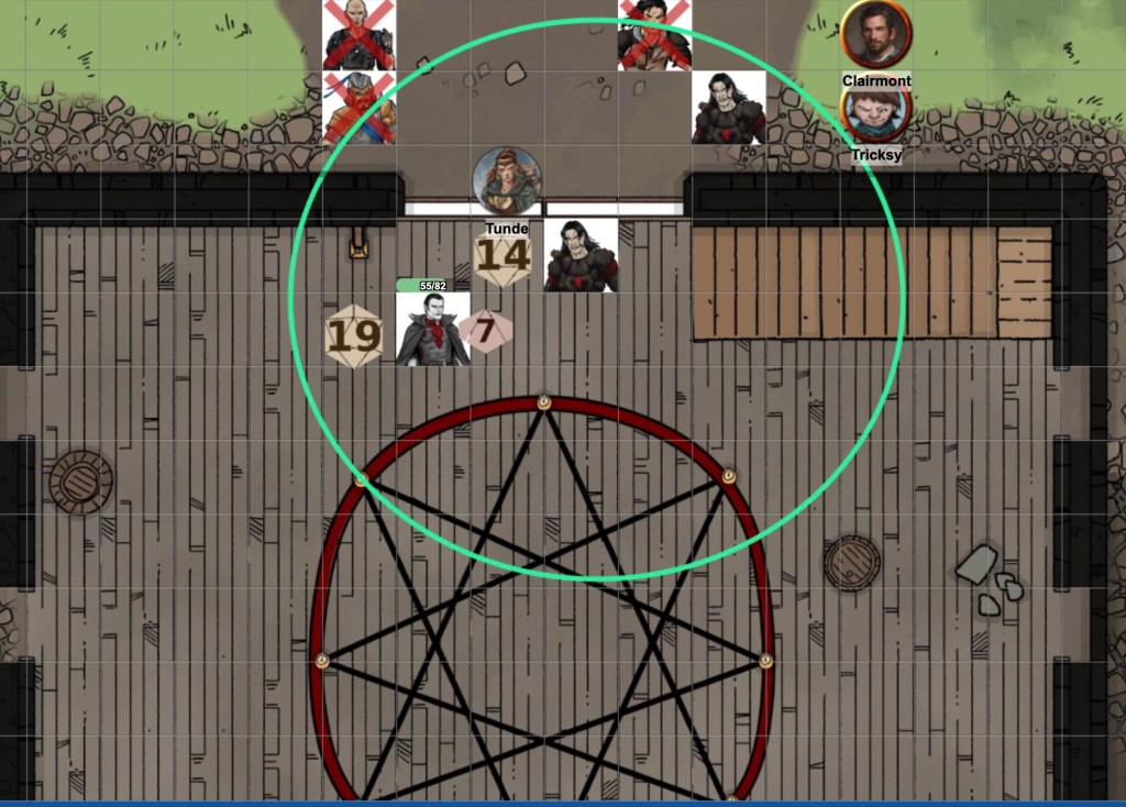 By this time, the others have finished off the guards and got the doors open. Tunde heals Clairmont, Tricksy casts fog cloud, and the characters make good their escape.
