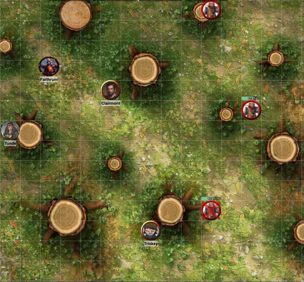Their business in Triolo complete, the party set off for the White Forest. I used a 13th Age style travel montage for the trip. I asked one player to describe a problem that the party faces as they travel, then asked the next player to propose a solution. That player then comes up with a new problem for the third player to solve and so on, until everyone has had a go at inventing and solving a problem. So, as the adventurers travelled into the forest, they had to find a way across a river with a collapsed bridge, “rescue” Tricksy from a group of admiring young ladies, lubricate a rusty Farthrum, and deal with Bill the mule who had eaten a clump of psychotropic mushrooms.