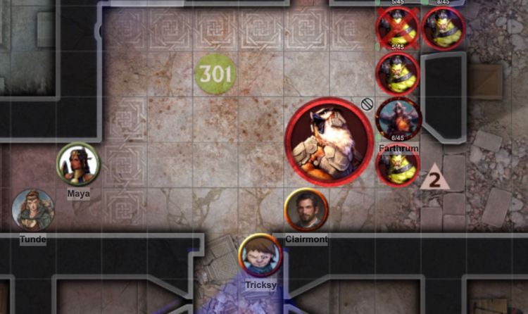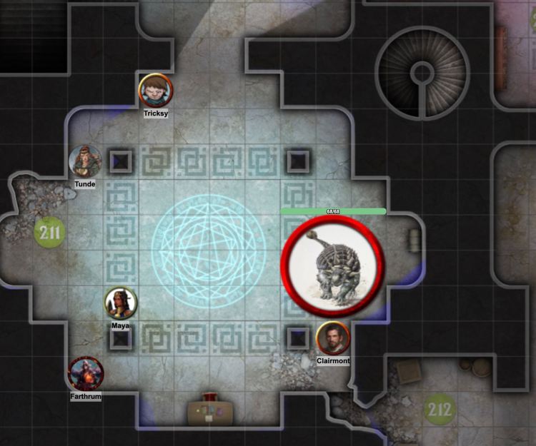 Unfortunately, Pop the spider is spotted by the dire owlbear in the next chamber, and a small band of trollkin and the owlbear attack the party. Farthrum attacks the owlbear as the trollkin grunts follow it into the room. Both Pop and Professor Yaffle are killed – poor Pop is incinerated by his own master’s fireball – but the characters are victorious. There’s no time to celebrate, though, as reinforcements are on the way. Maya readies a guiding bolt and Tricksy casts fog cloud in the direction of their foes.