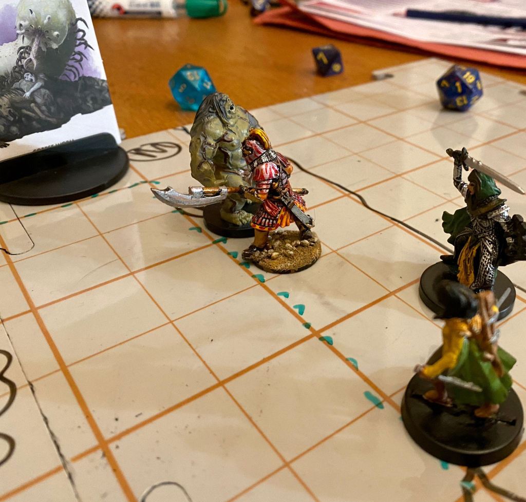 Bubbles casts spike growth so the disgusting monsters take damage as they close to attack the adventurers. Penumbra casts shatter and Zygmunt casts fireball; both spells are effective but make a lot of noise. During the battle Zygmunt is bitten by a ghoul but avoids catching darakhul fever. Once the fight is over The Gears goes round destroying all the corpse worm’s eggs.