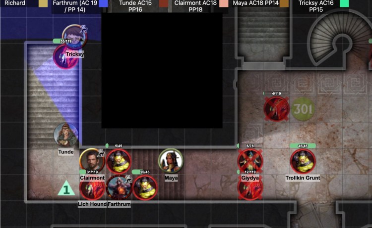 As the second wave of trollkin and undead lich hounds emerge from Tricksy’s fog cloud, the characters launch their readied attacks. Maya casts spirit guardians which proves very effective, and the adventurers look to be gaining the upper hand when a third wave of enemies appears. Then, Maya goes down and the spirit guardians vanish. Hard pressed, the others heal Maya and flee for the stairs, leaving her behind and incapacitated.
