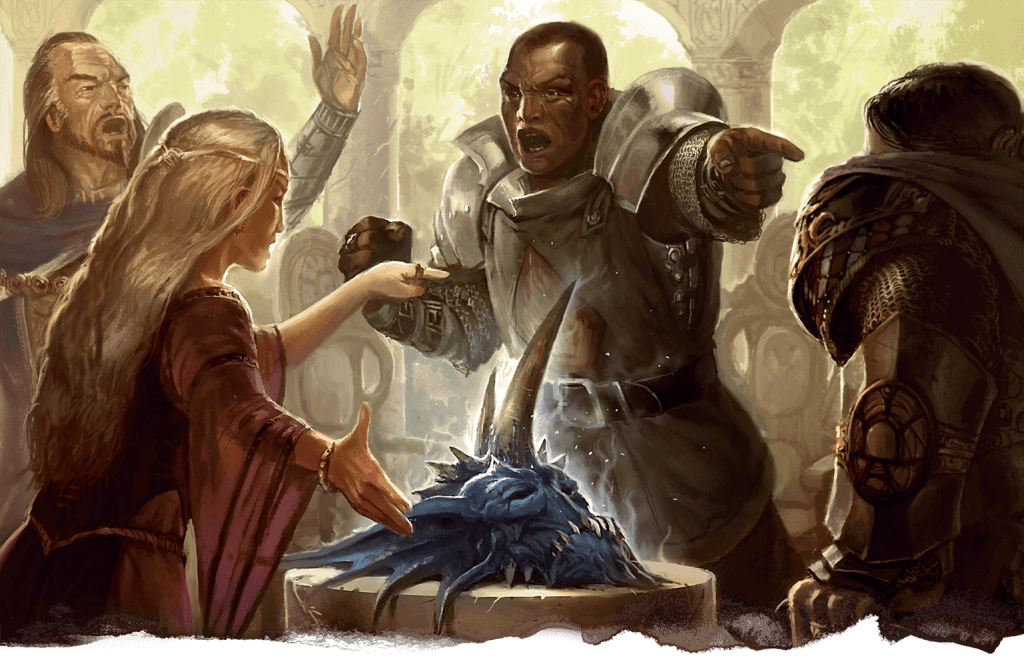Outside the Lord’s Palace, Leosin briefs the party. Following the assassination of the Masked Lord Arthagast Ulbrinter, the factions and leaders of the Sword Coast have come together to oppose the Cult of the Dragon and the characters must report to the Council of Waterdeep.