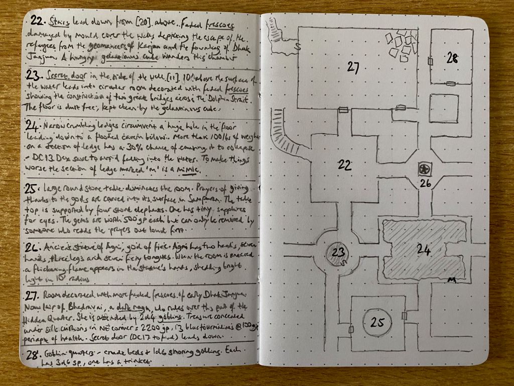 For Week 4 of Dungeon23, we’ve descended the stairs from Room 20 in the Caverns of the Heart Eaters to a series of ancient rooms and passageways dating back to the founding of Dhak Janjua, now home to Bhadravai, a dark naga.