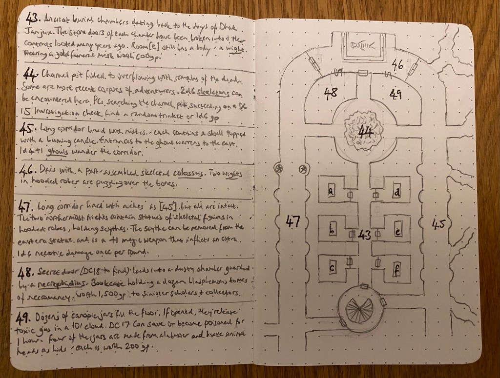 44. Charnel pit filled to overflowing with the remains of the dead. Some are more recent corpses of adventurers. 2d6 skeletons can be encountered here. PCs searching the charnel pit succeeding on a DC 15 Investigation check find a random trinket or 1d6 gp.