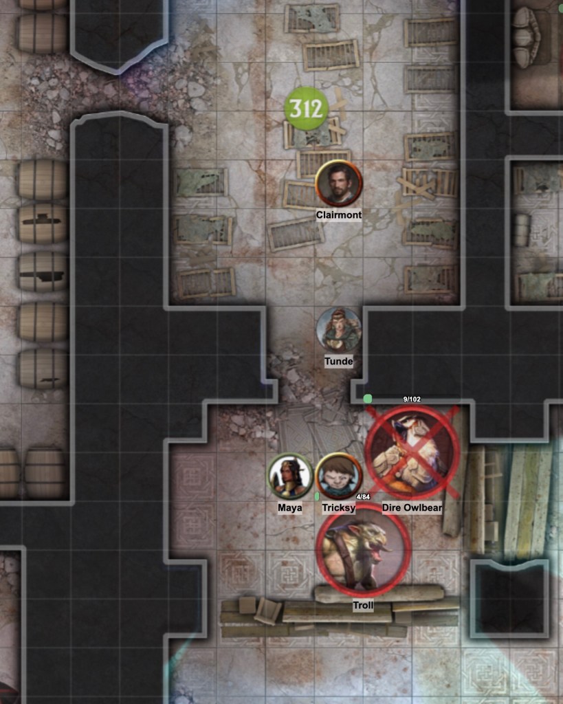 Heading through the north door from the trapped corridor, the adventurers enter the Great Hall where most of the trollkin have repositioned themselves on the far side of the barricade. The characters slay the two grunts, then Clairmont lobs two fireballs over the barricade while the others snipe at any foes who dare to pop up from behind their fortification. When Maya approaches surrounded by her spirit guardians, the two reavers Bjrnyar and Gostov make a run for it, leaving the troll and dire owlbear behind to be slain by the characters.