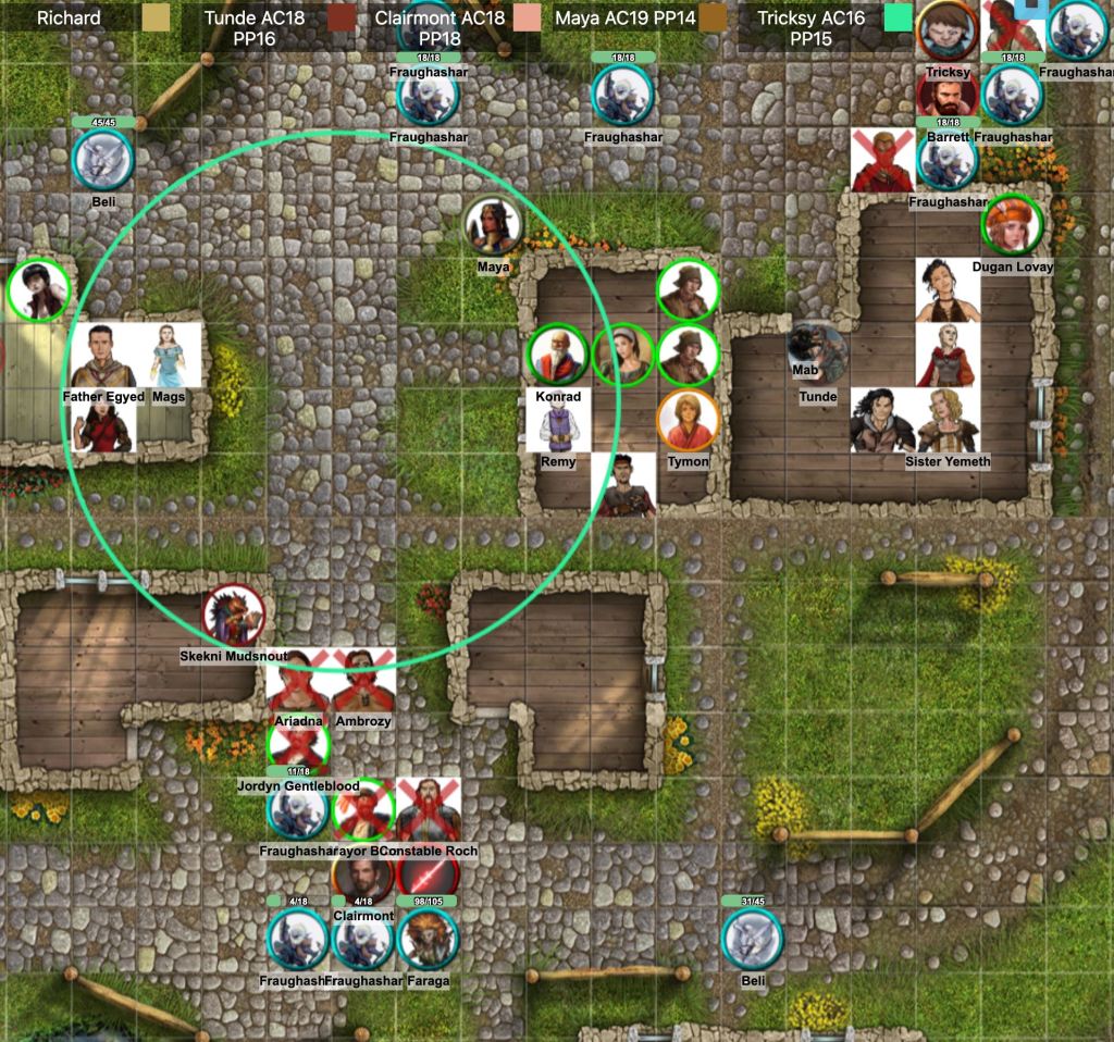 As the fey attack the terrified townsfolk, but Tricksy casts fog cloud allowing a large group of villagers to escape into the nearby houses. Faraga exhales a cone of pine needles which knocks out the mayor, Constable Roch, the merchant Jordyn Gentleblood, and Ambrozy and Ariadna from The Cage. She follows up with blows from her staff, and Clairmont falls unconscious.