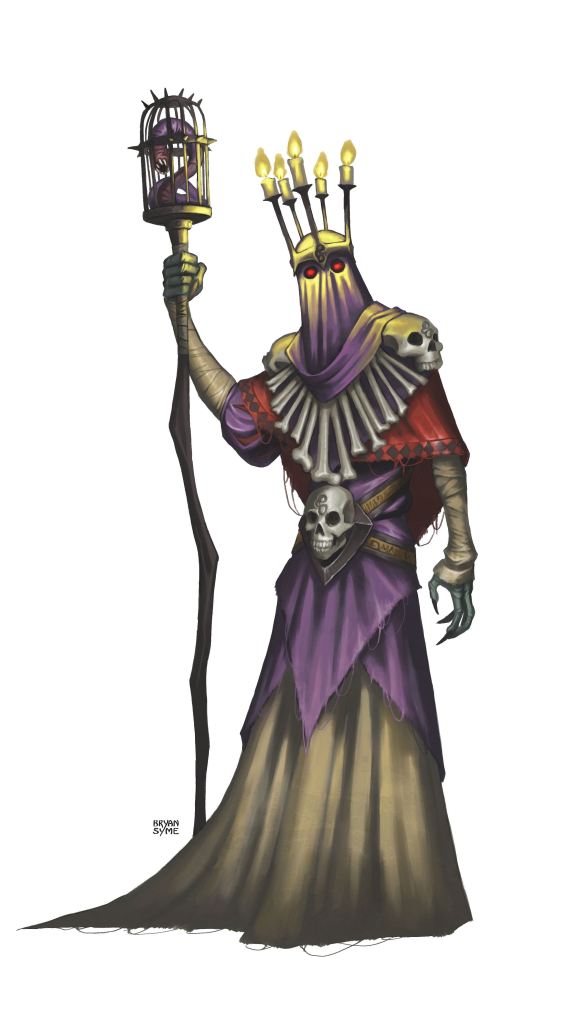 Penumbra hears the voice of Sister Adelind in her head, urging her to use the Holy Robes to unleash a fiery explosion. Realizing this will almost certainly kill half the party as well as the ghouls, she turns invisible instead and moves closer to Radomir, slaying the high priest with her Agonizing Blast. Zygmunt heals Bubbles, and Vicmorn leaps onto the cage, and manages to pick the lock, freeing Avgost who leaps to safety.