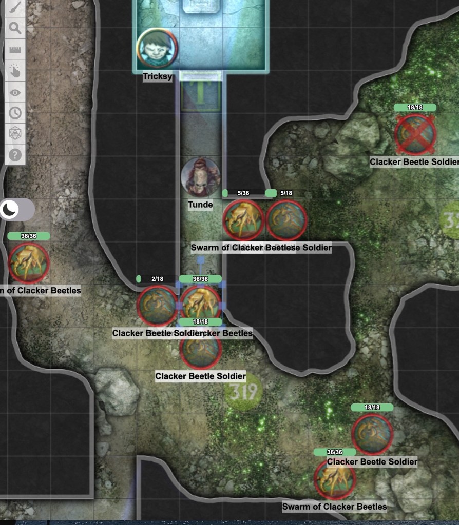 As the adventurers take a short rest in one of the dwarven tombs, Tunde’s familiar Mab, who has remained outside in the guise of a beetle husk, warns her master that a clacker beetle is approaching.