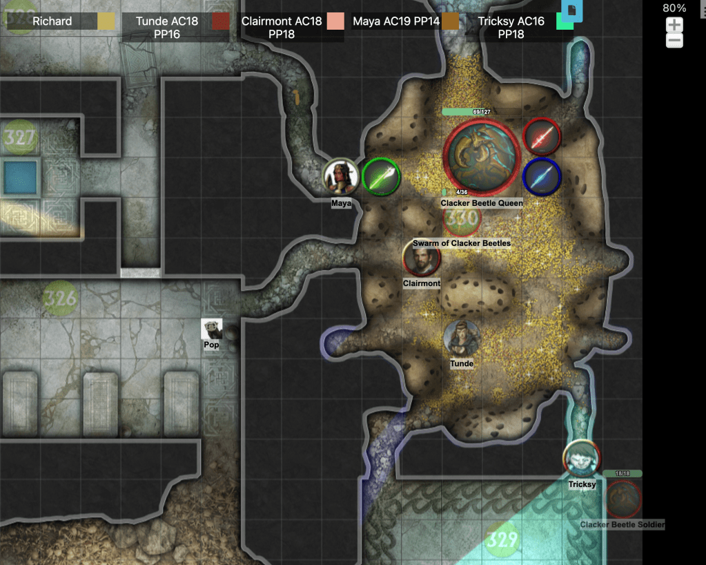 It’s taken a while but the characters finally dealt with the clacker beetles in this week’s session! I added a clacker beetle queen to the nest, reskinning the carrion beetle from Tome of Beasts 1 and replacing its Acid Spit with a more powerful version of the soldier’s Clack. We’re not quite done with the Clacking Caverns yet as my players are determined to figure out the two floating pools.