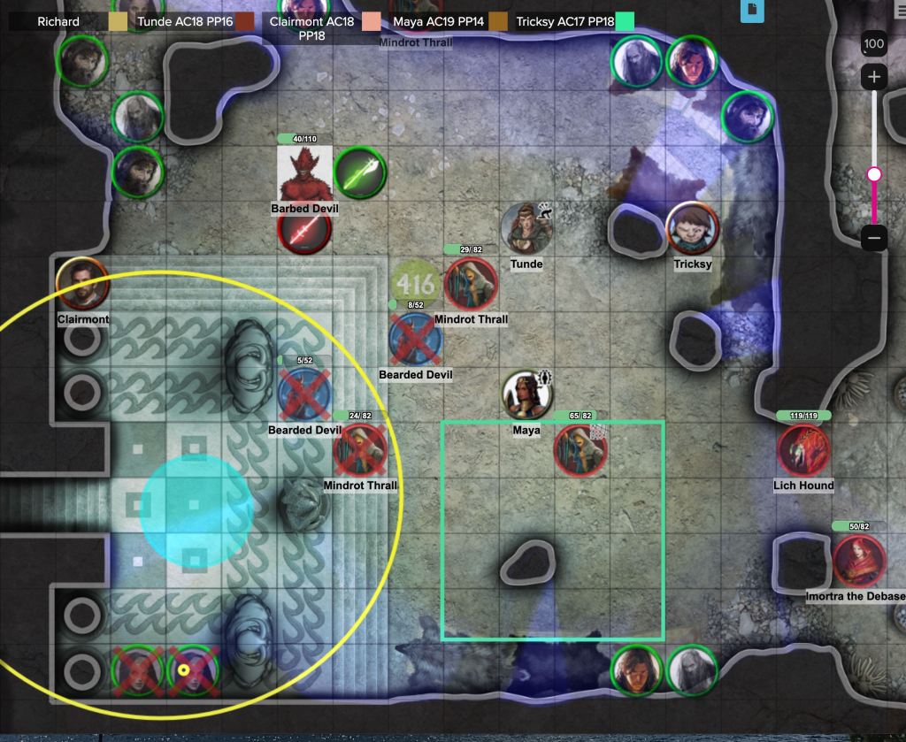 Clairmont casts spirit guardians again after failing to banish the devil but the lich hound is snapping at Maya’s heels, trying to pull her down to gut rip her. Meanwhile, Tunde casts phantasmal force, creating an illusion of a planetar which keeps the devil busy.