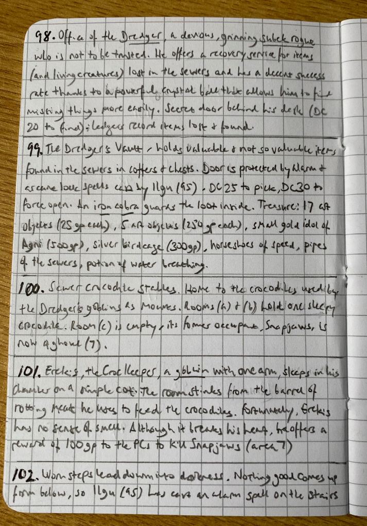 98. Office of The Dredger, a devious, grinning subek rogue who is not to be trusted. He offers a recovery service for items (and living creatures) lost in the sewers and has a decent success rate, thanks to a powerful crystal ball that allows him to find missing things more easily. Secret door behind the desk (DC 20 to find). Ledgers record items lost & found.