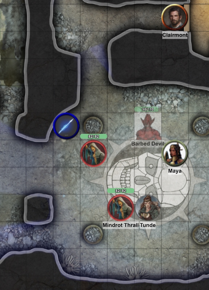They appear inside the skull circle inlaid in the floor of the Bat Caverns in front of Imortra the Debased and her barbed devil companion! Maya banishes the barbed devil back to the Eleven Hells, while Clairmont attacks Imortra. The mage doesn’t feel like sticking around and vanishes. Meanwhile, two mindrot thralls appear from the prisoners quarters and vomit spores over Maya and Tunde. The clerics all cast spirit guardians and the thralls are soon dispatched.