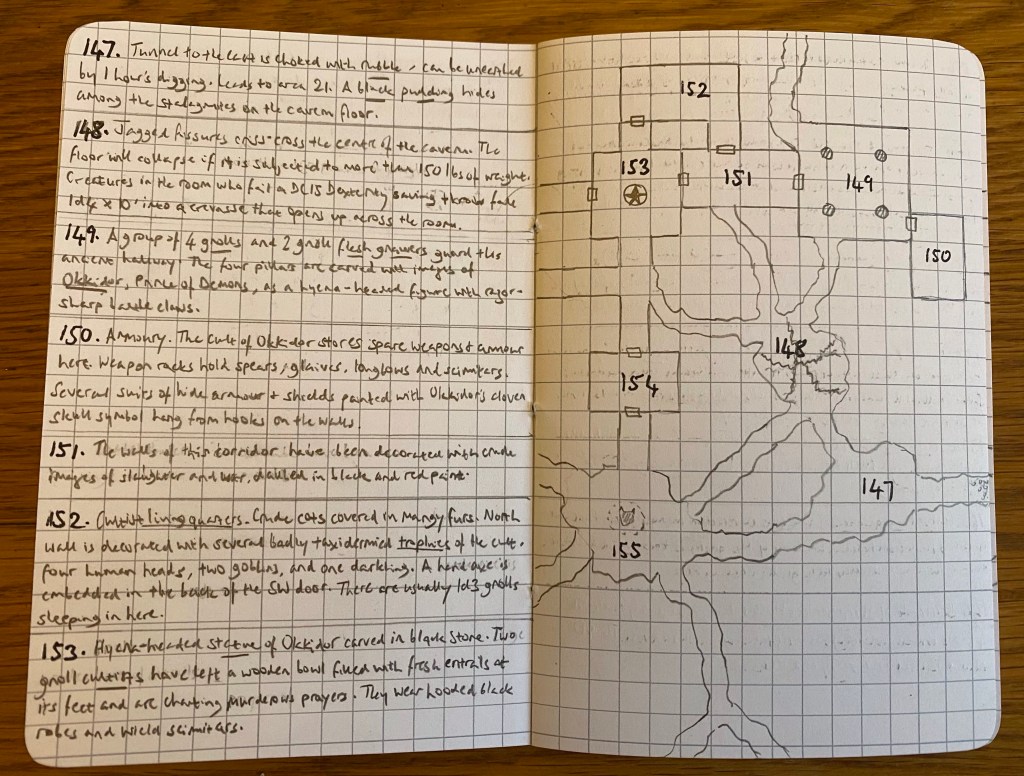 150 – Armoury. The cult of Okkidor stores spare weapons & armour here. Weapon racks hold spears, glaives, longbows, and scimitars. Several suits of hide armour & shields painted with Okkidor’s cloven skull symbol hang from hooks on the walls.