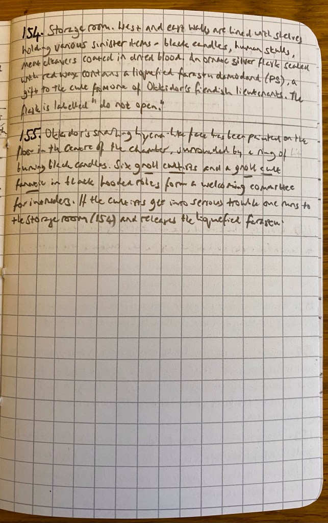 154 – Storage room. West and east walls are lined with shelves holding various sinister items – black candles, human skulls, meat cleavers coated in dried blood. An ornate silver flask sealed with red wax contains a liquefied farastu demodand (Planescape), a gift to the cult from one of Okkidor’s fiendish lieutenants. The flask is labelled “do not open.”