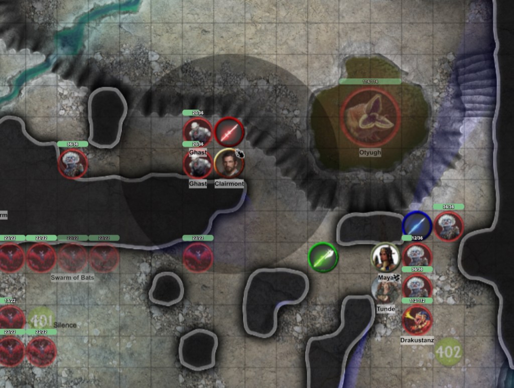 Clairmont fails another Con save (I have rarely seen a player fail so many consecutive saving throws!) and becomes paralyzed again. The second group of ghasts begin feasting on the helpless cleric! Maya is also running low on hp but her death ward kicks in, keeping her in the fight.
