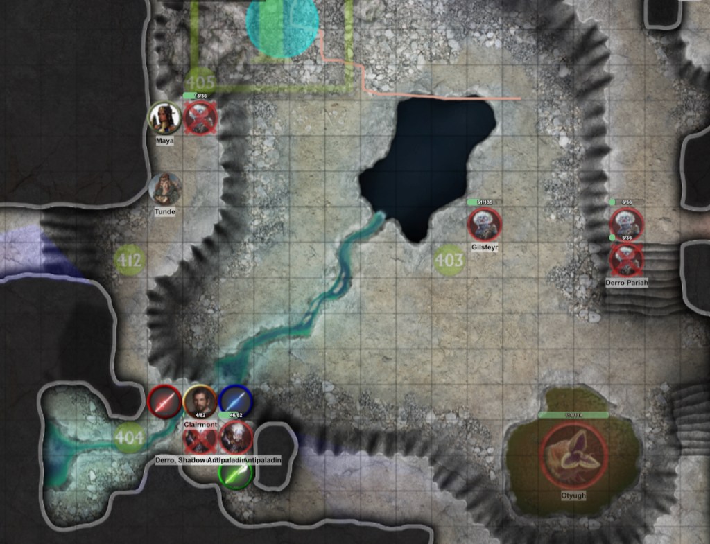 Back in the large cavern, the characters battle Gilsfeyr, his summoned ghasts, derro pariahs and a pair of shadow antipaladins. This time, things go much better for the adventurers. Maya turns the ghasts, Clairmont casts daylight to nullify Gilsfeyr’s darkness, and all three clerics summon their spiritual weapons.